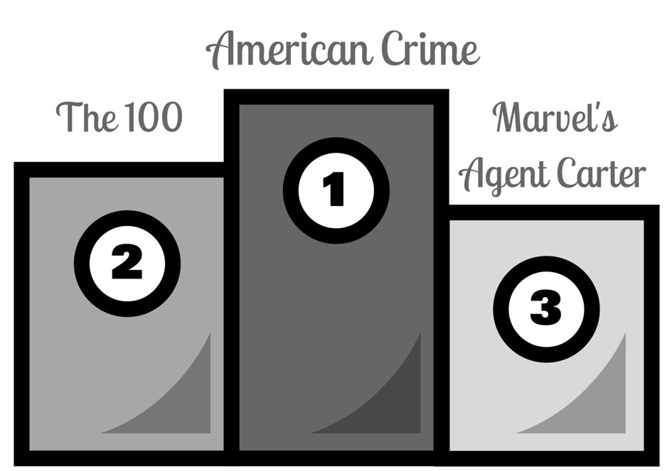 La saison 1 d’American Crime était déjà incroyable, mais la saison 2 m’a bouleversée ! C’est rare de voir aborder la question des agressions sexuelles sur les hommes, et c’était tellement bien traité que ça mérite largement une 1ère place (voir mon article de mars). The 100 (2014, The CW — saison 3, 16 épisodes — drame, science-fiction) mérite aussi amplement cette 2e place : les saisons s’enchaînent et continuent à être de très bonne qualité ! Enfin, j’ai voulu rendre hommage à Marvel’s Agent Carter (2015, ABC — 2 saisons, 18 épisodes — action, comédie, drame, science-fiction) qui a été annulé après seulement 2 saisons. J’ai passé de très bons moments devant cette série pleine d’humour et je suis vraiment déçue de la voir s’arrêter.