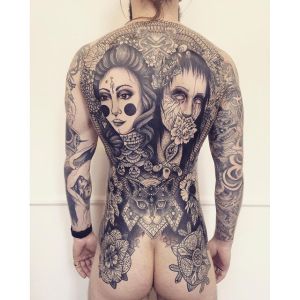Du côté du client, cela permet de faire cohabiter deux artistes au sein du même tatouage, dans une cohérence globale, et non les uns à côté des autres comme on le fait le plus souvent. C’est une opportunité de faire cogiter deux tatoueurs sur un projet personnel sur lequel ils apportent chacun leur sensibilité, souvent différente et donc complémentaire.