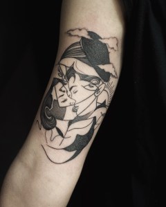 Cela existe certainement depuis très longtemps mais j’ai remarqué dernièrement des collaborations entre tatoueurs qui me semblent vraiment inspirantes. C’est fascinant de voir deux talents s’entremêler au service d’un projet, d’une peau. Chacun apporte son tracé et son univers pour croiser et fusionner en une création unique.